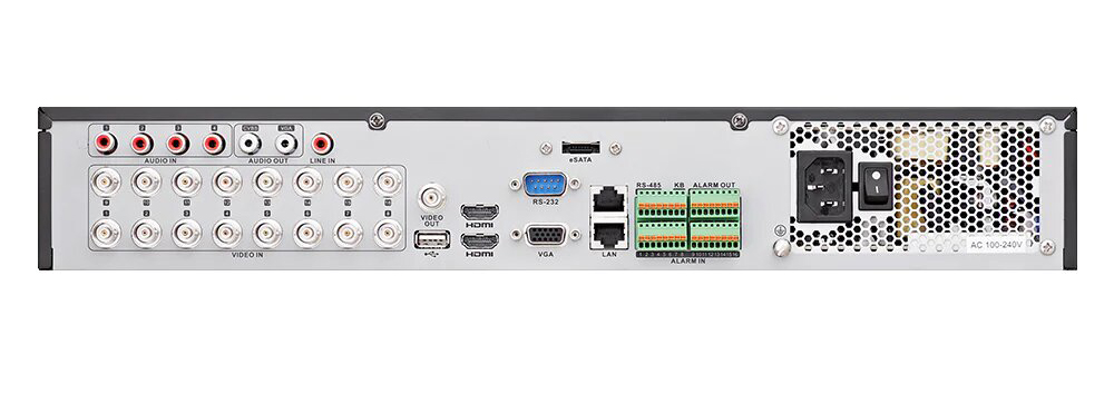 Videograbador 5en1 DVR | 16CH 8MP 1.5U 4xHDD Audio 4/2 Alarma 16/4 | 16CH Analógicos 8MP + 18CH IP 12MP | (Total Hasta 34CH IP) | 4 interfaces SATA HDD 12TB | Codificación 8MP/8fps, 5MP/12fps. | Ancho de banda 320/128Mbps | POS. RAID 0, 1, 5, 6, 10. E/S Alarma 16/4 y Audio 4/2.