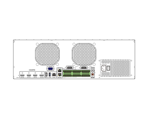 Grabador NVR | 128CH 16MP | Ancho de banda 768Mbps | Reproducción 16CH simultáneamente | 4X HDMI, VGA, | E/S Audio, E/S Alarma 24/8 | Detección | Facial, | Perímetro. Metadatos humanos y vehículos, | Matrículas. | RJ45 1000Mbps×2 | HDD SATA | ×16 (hasta 10TB), 2xE-SATA